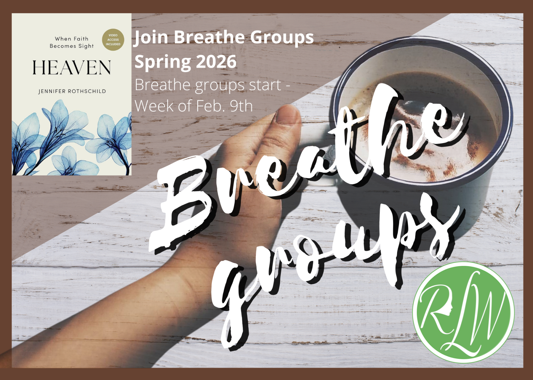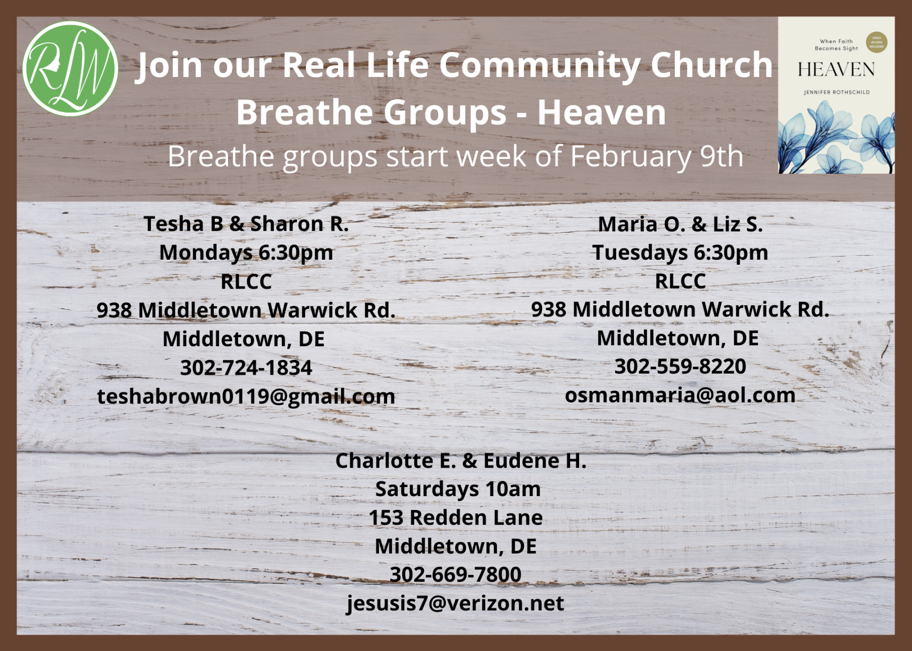 The ladies will be reading "Heaven" by Jennifer Rothschild for our Spring Breathe Groups! We are selling books for $25 dollars at the Info Desk. Groups will begin the week of February 9th, see below to connect with a group leader.